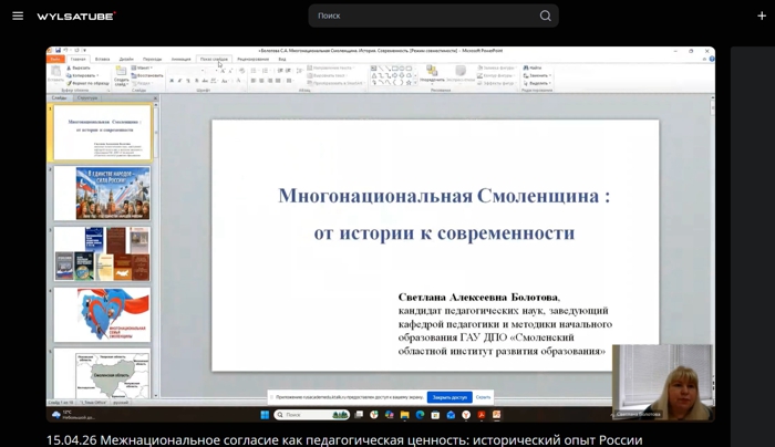 На Круглом столе Ассамблеи «Межнациональное согласие как педагогическая ценность: исторический опыт России» 15 апреля в дистанционном формате выступила Болотова Светлана Алексеевна, кандидат педагогических наук, заведующий кафедрой педагогики и методики начального образования ГАУ ДПО СОИРО с докладом по теме: «Многонациональная Смоленщина: от истории к современности».