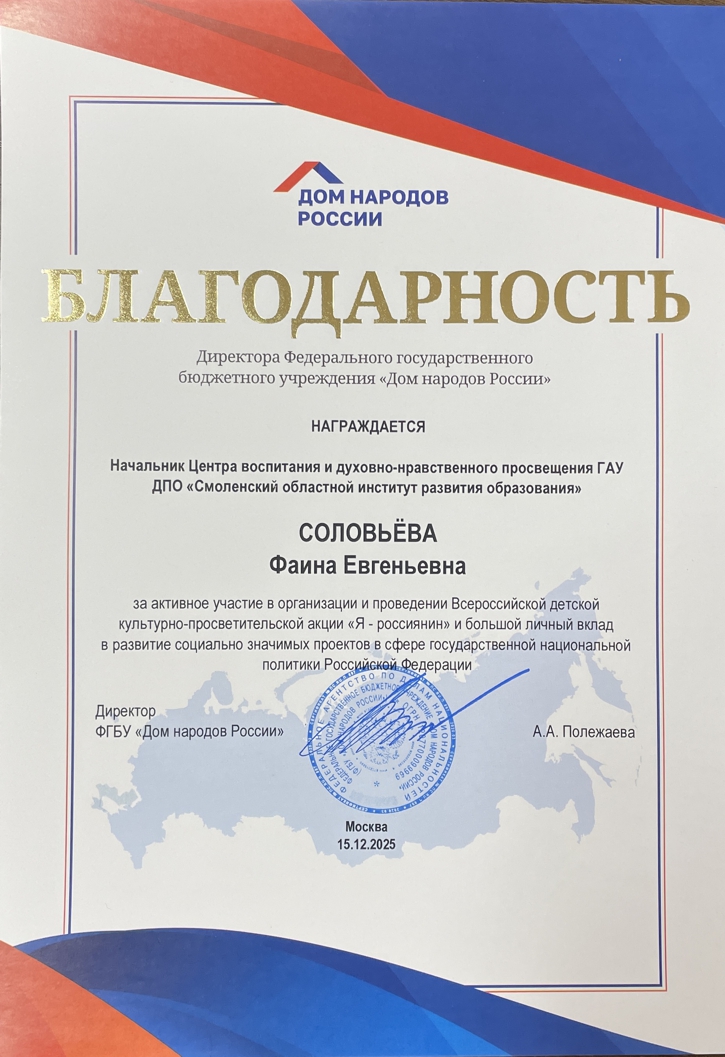 Сотрудник ГАУ ДПО СОИРО Соловьева Ф.Е., начальник Центра воспитания и духовно-нравственного просвещения, профессор кафедры методики преподавания предметов основного и среднего образования получил благодарность от директора ФГБУ "Дом народов мира" за активное участие в организации и проведении Всероссийской детской культурно-просветительской акции "Я-россиянин" и большой личный вклад в развитие социально-значимых проектов в сфере государственной национальной политики Росийской Федерации.