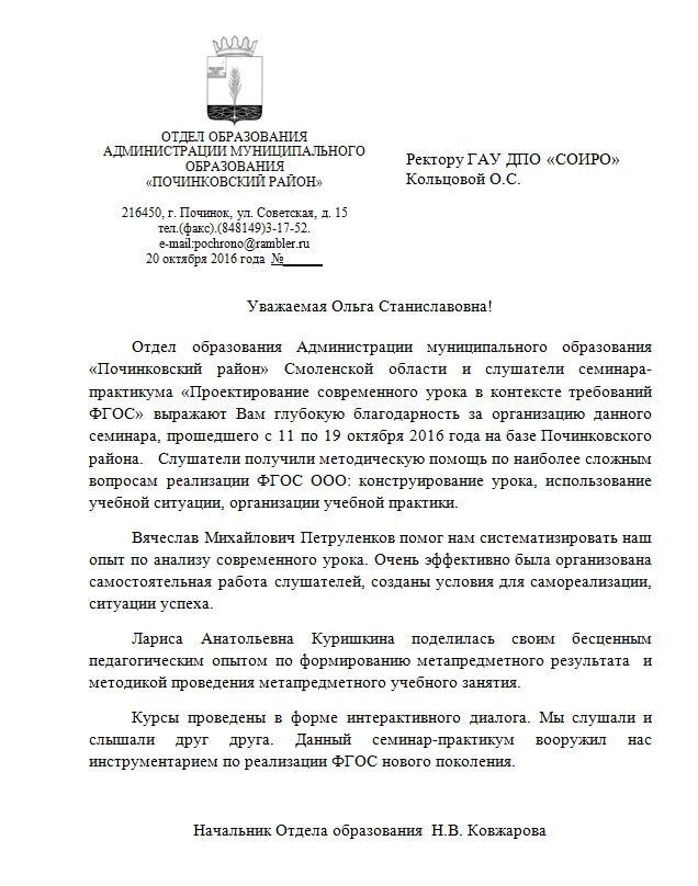Благодарность за организацию семинара от Отдела образования Администрации муниципального образования «Починковский район» Смоленской области и слушателей семинара-практикума ...>>