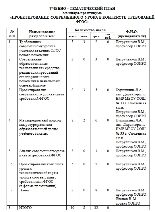 В ходе семинара участники анализировали уроки в свете требований ФГОС, разрабатывали индивидуальные проекты конспектов урока и технологических карт урока, защищали индивидуальные проекты.