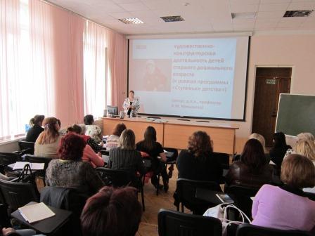 Самым ярким и значимым событием семинара стала встреча с Натальей Михайловной Конышевой, доктором педагогических наук, профессором, научным руководителем программы предшкольного образования «Ступеньки детства» и автором развивающих учебно-методических материалов по художественно-конструкторской деятельности в рамках данной программы. Наталья Михайловна на практике познакомила слушателей с ведущей идеей программы – идеей гармоничного развития ребенка, без искусственного ускорения, с максимальным учётом природных законов развития, а также с особенностями организации художественной деятельности дошкольников в условиях ДОУ.