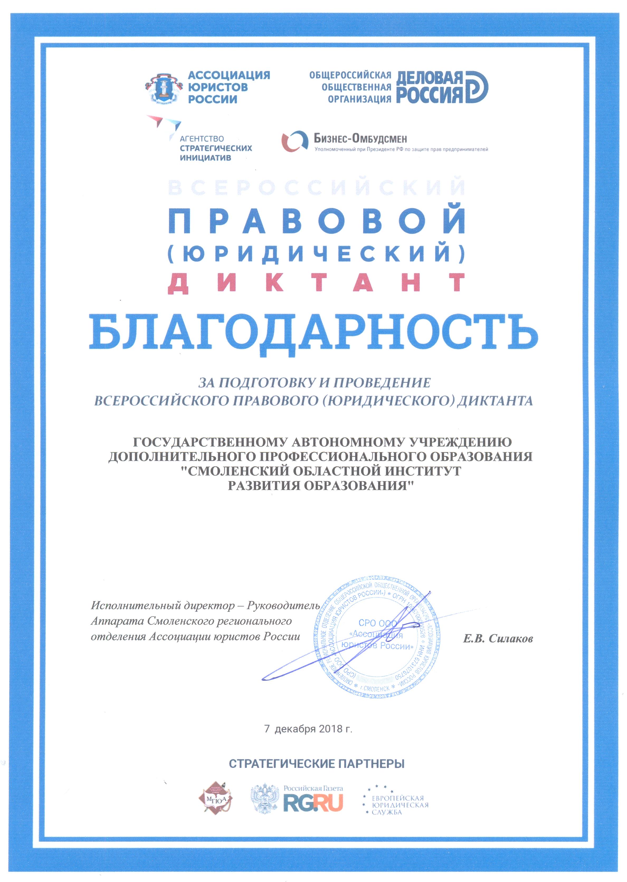 7 декабря 2018 года, в рамках празднования 25-летия принятия Конституции Российской Федерации на базе Смоленского областного института развития образования в режиме онлайн прошел очередной этап масштабного общественного проекта «Всероссийский Правовой диктант». В этом году он впервые охватил все регионы страны.