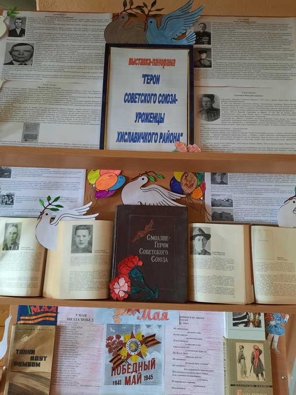 7 мая, в преддверии праздника Великой Победы, в школьном информационно-библиотечном центре МБОУ «Хиславичская СШ» была оформлена выставка-панорама «Герои Советского Союза - уроженцы Хиславичского района».