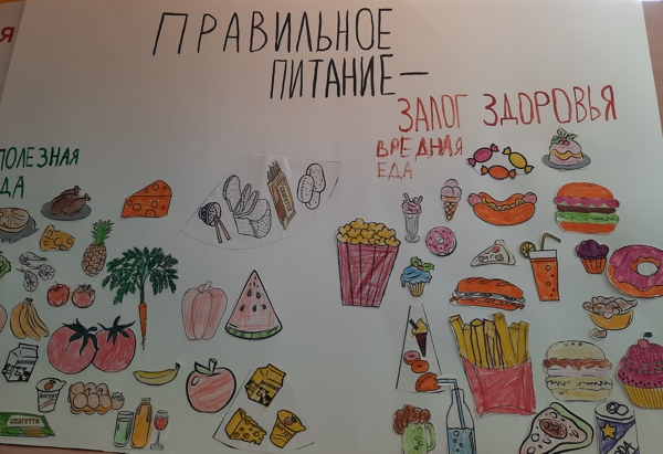 Мероприятие принесло много полезных знаний о правильном питании и здоровом образе жизни. В завершении мероприятия участники с вожатыми изготовили коллаж «Правильное питание-залог здоровья». Ребята сами распределили продукты «Полезная еда», «Вредная еда».