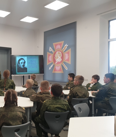 Мероприятие подготовили и провели педагог-библиотекарь Волкова А.М., учитель русского языка и литературы Белоусова Н.Н. «Люблю Отчизну я!..» литературно-музыкальный калейдоскоп, посвящённый 210-летию со дня рождения поэта М. Ю. Лермонтова. 6 классы. Кадеты совершили путешествие в прошлое XIX века. Ведущие мероприятия Василькова Мария, Ясинский Александр в 6а классе; Антоненко Ариана, Бабёнышев Руслан в 6б классе познакомили ребят с основными этапами жизненного пути Михаила Юрьевича Лермонтова - поэт, прозаик, драматург, художник, музыкант, шахматист, яркий гений.