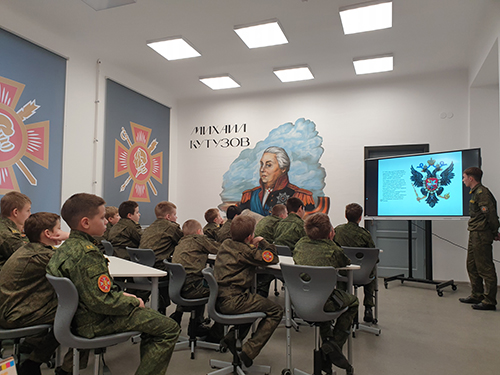 Председатель Совета Обучающихся кадет 11б класса Влад Левицкий познакомил ребят с российской символикой, рассказал, почему именно так выглядит герб, что означает каждый элемент, изображённый на нём, как менялся российский символ на протяжении истории страны.