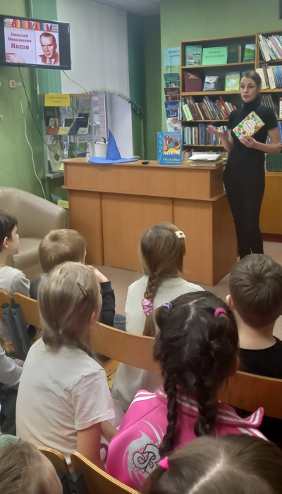 Мероприятие по книге Н.Носова провела библиотекарь Смоленской областной библиотеки для детей и молодёжи им.И.С.Соколова –Микитова О.В.Малкова. Первоклассники познакомились с биографией писателя, вспомнили названия улиц Цветочного города, героев сказки, коллективно рисовали портрет Гуньки, посмотрели отрывок из мультфильма по сказке.Очень красочная презентация сопровождала рассказ библиотекаря. Дети остались очень довольны.
