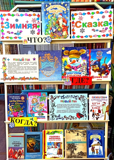 На выставке представлены книги, которые помогут создать праздничное настроение и весело встретить Новый год, сделать зимние каникулы незабываемыми.Также на выставке размещены необычные праздничные украшения, оформленные из книг различных тематик.