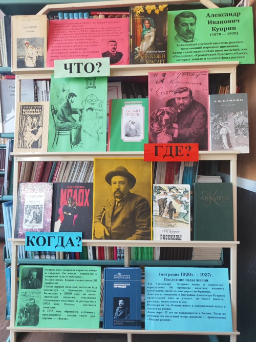 Среди выдающихся русских писателей начала XX века одно из наиболее видных мест принадлежит Александру Ивановичу Куприну. Начав литературную деятельность в самом конце 80-х годов прошлого века, Куприн за свою почти пятидесятилетнюю творческую жизнь создал немало значительных произведений, выдержавших испытание временем. В школьном информационно-библиотечном центре МБОУ СШ №2 проводится книжная выставка, посвященная известнейшему русскому писателю Александру Ивановичу Куприну (1870 - 1938), которому 7 сентября исполняется 155 лет со дня рождения.