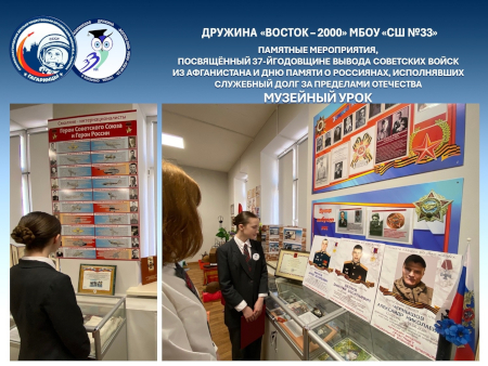 16-17 февраля в музее МБОУ «СШ № 33» города Смоленска для учеников 4 и 8 классов прошли уроки, посвященные Дню памяти о россиянах, исполнявших служебный долг за пределами Отечества.