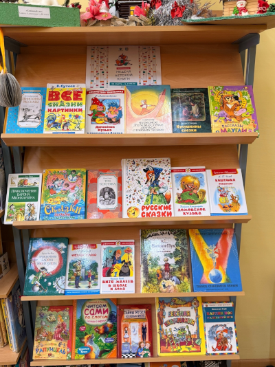 - Выставка книг - на полках представлены произведения разных жанров: от русских народных сказок и историй о приключениях до весёлых рассказов и познавательных повестей .
