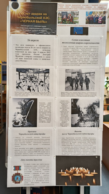 К 26 апреля - Дню памяти о Чернобыльской катастрофе - педагог-библиотекарь Модина Е.В. подготовила в ИБЦ МБОУ «СШ № 33» города Смоленска выставочный стенд «Чёрная быль», приуроченный к 40-летию аварии на Чернобыльской АЭС.
