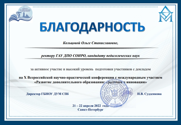 Государственное бюджетное нетиповое образовательное учреждение Дворец учащейся молодежи Санкт-Петербурга выразил благодарность ректору ГАУ ДПО СОИРО Кольцовой Ольге Станиславовне за подготовку участников X Всероссийской научно-практической конференции с международным участием "Развитие дополнительного образования: традиции и инновации"