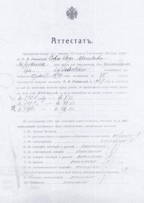 Аттестаты представляли собой лист формата А4, в верхней части которого содержались данные об учащемся (фамилия, имя, отчество, звание, вероисповедание, год поступления, характеристика поведения за весь период обучения). Далее в столбик был выписан перечень обязательных и необязательных предметов, изучаемых в гимназии Е.И. Ровинской, с отметками напротив. В нижней части аттестата было указано, на основании какого документа учащийся считался окончившим учебное заведение. Подписывался аттестат всеми членами педагогического совета и председателем педагогического совета. Данный документ имел законную силу после того, как ставилась печать попечителя совета гимназии. В свидетельстве об обучении содержались те же данные, что и в аттестате (фамилия, имя, вероисповедание, звание, перечень предметов с отметками и прописывался закон, на основании которого выдавался подобный документ), но в конце указывалась причина, по которой обучающийся заканчивал свое обучение. Свидетельство подписывалось начальником учебного заведения без представления его педагогическому совету [44, Л. 2]. Отметим, что в ходе исследования были обнаружены архивные документы воспитанниц частной женской гимназии Е.И. Ровинской, относящихся к разному вероисповеданию: православному, римско-католическому и иудейскому.