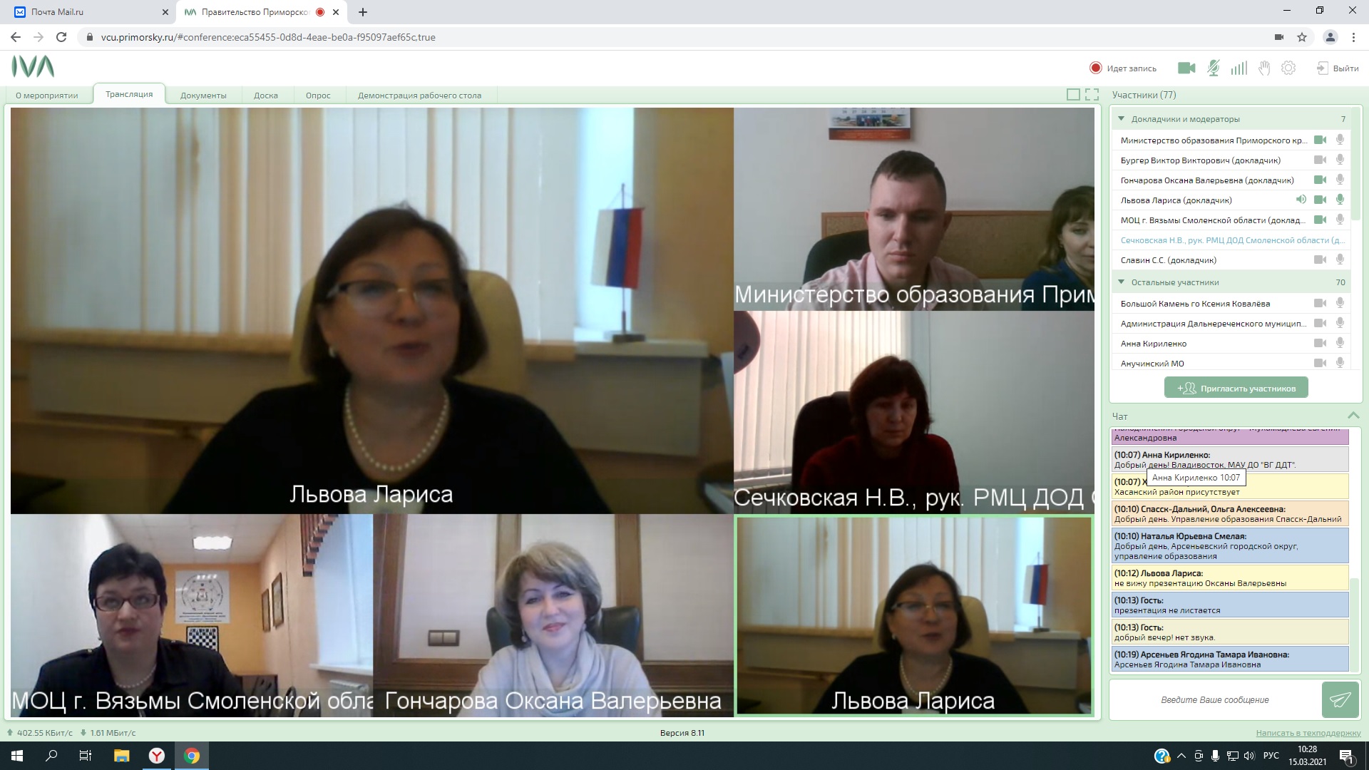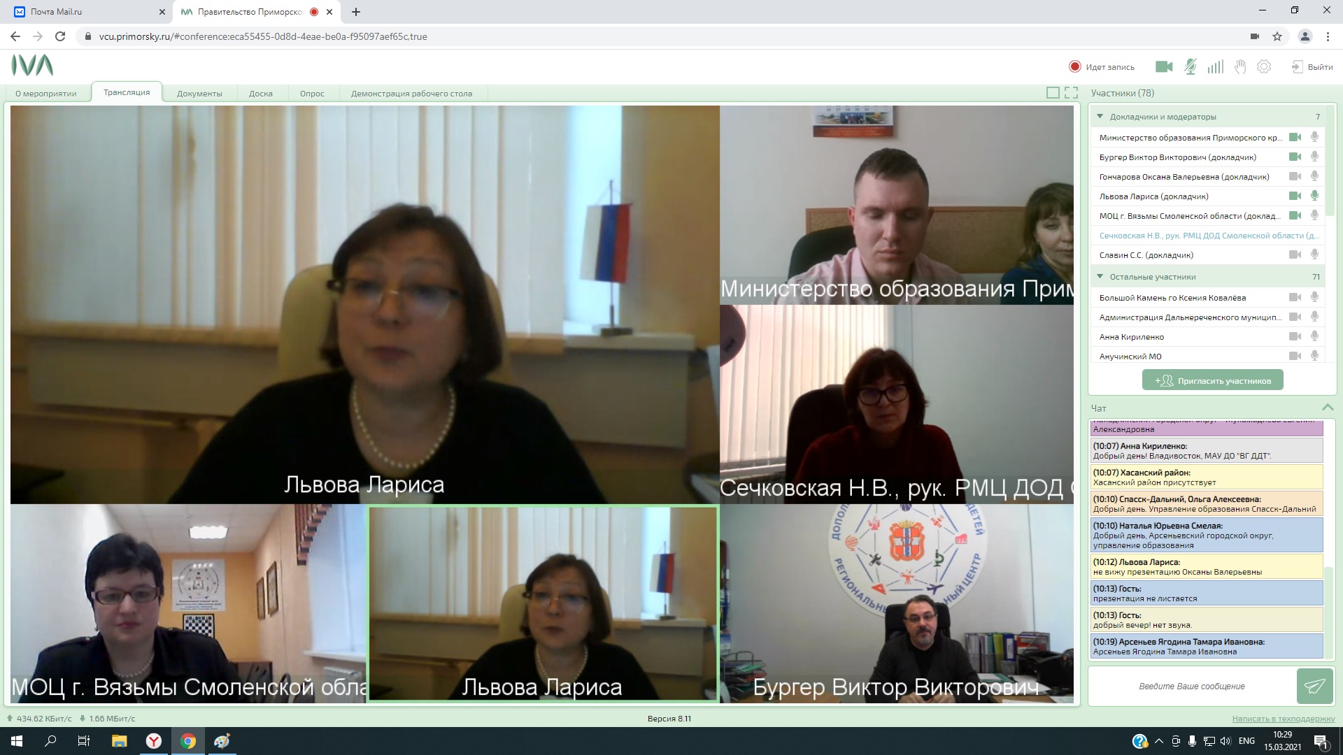 15 марта в режиме ВКС состоялось рабочее совещание по вопросу создания муниципальных опорных центров в муниципальных образованиях Приморского края с участием представителей Министерства просвещения Российской Федерации, федерального государственного бюджетного учреждения культуры «Всероссийский центр развития художественного творчества и гуманитарных технологий» – федерального оператора Целевой модели, РМЦ ДОД ГАУ ДПО СОИРО Смоленской области, РМЦ ДОД ООО «Институт развития персонифицированных систем управления» Омской области и специалистов системы дополнительного образования Приморского края.