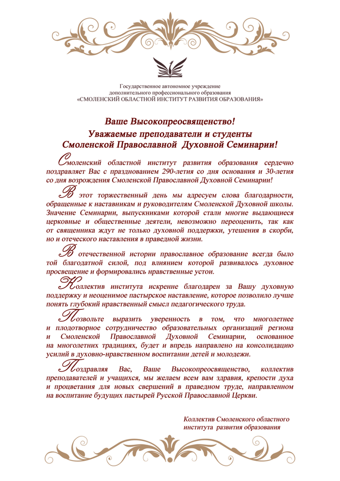 Коллектив Смоленского областного института развития образования поздравляет руководство, педагогический коллектив, выпускников и студентов Смоленской Православной Духовной семинарии с 290-летием учебного заведения и 30-летием возрождения духовного образования на Смоленщине.