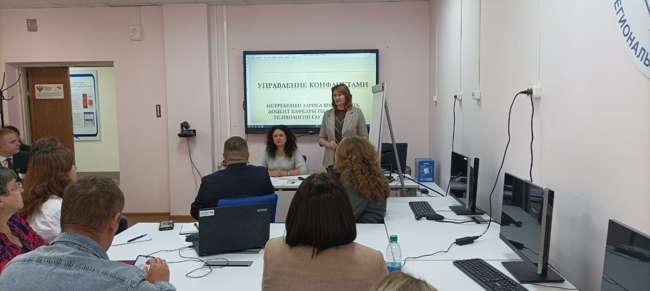 Нетребенко Лариса Викторовна, доцент кафедры педагогики и психологии ГАУ ДПО СОИРО, провела мастер-класс по управлению конфликтами. Она раскрыла типы конфликтов, их причины и эффективные способы устранения проблемных ситуаций.
